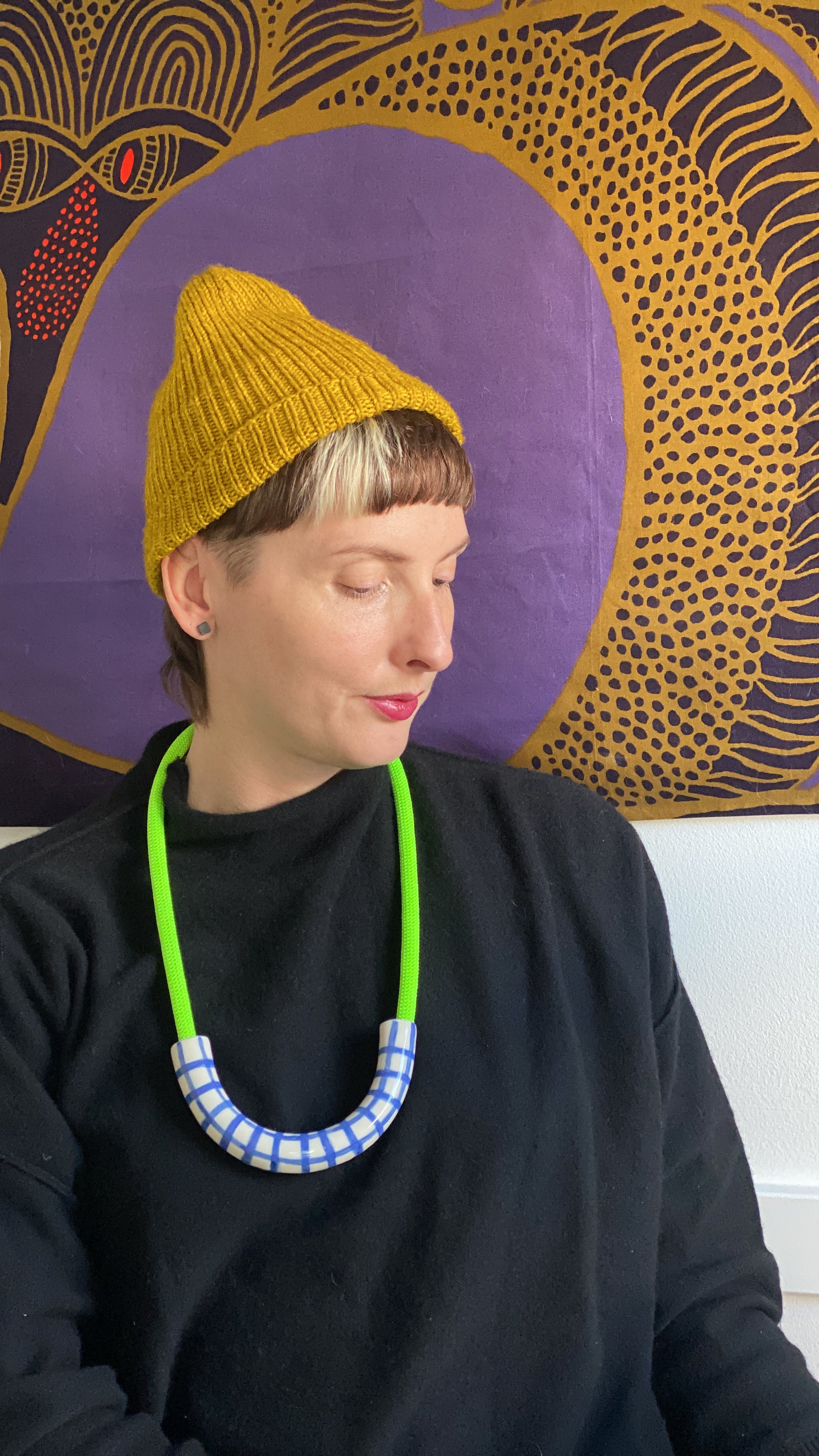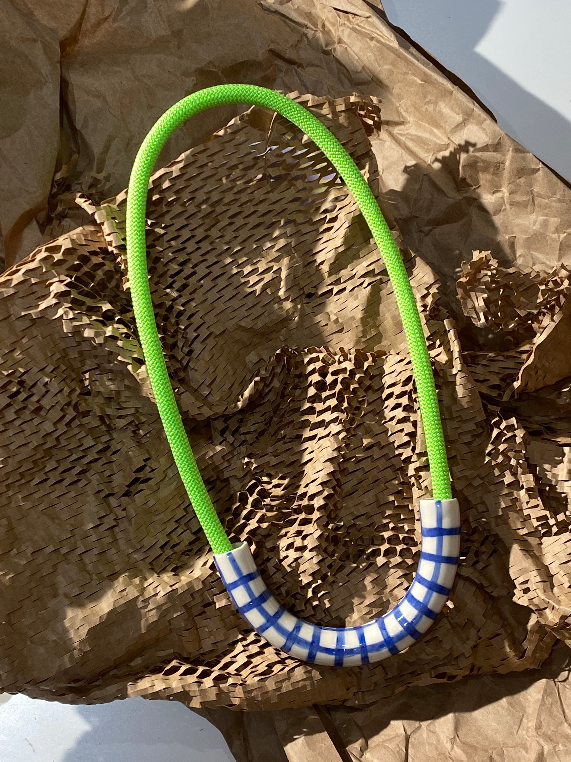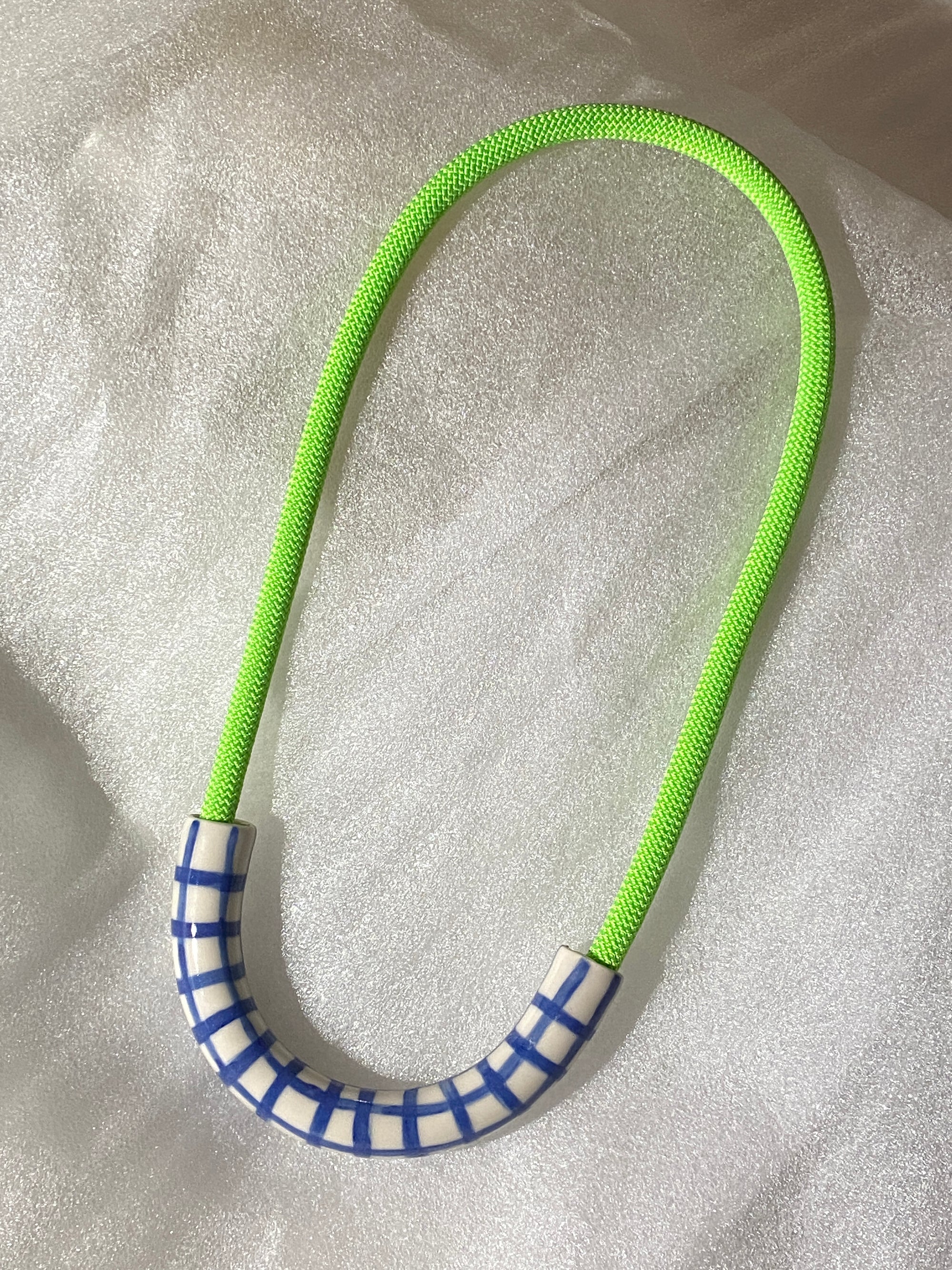 Blue Hatch + Neon Green Rope • Ceramic Necklace